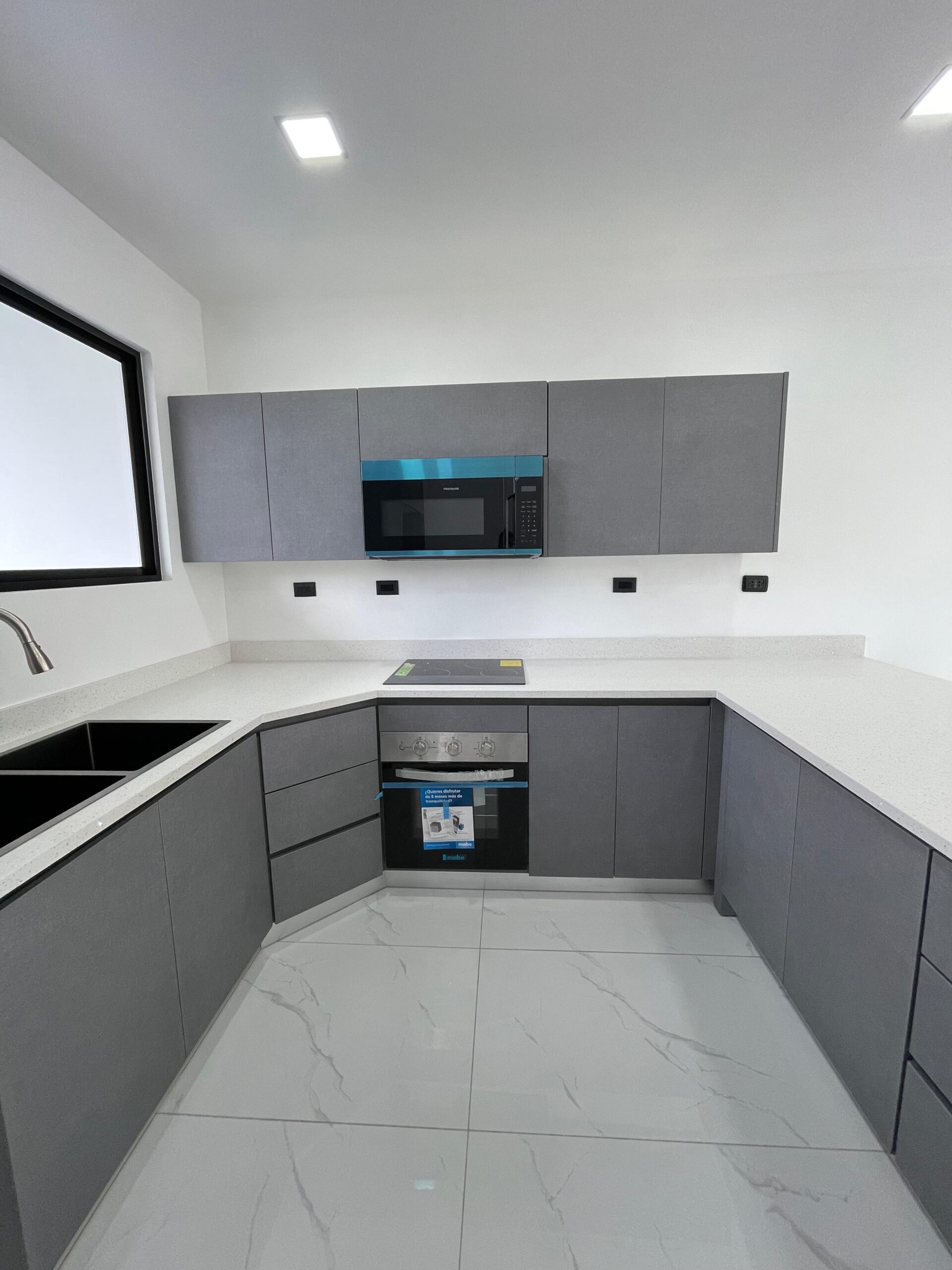 Modern kitchen: contemporary cabinetry, electric cooktop with range hood, microwave, and conventional electric oven.